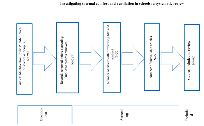 روش کار: این مطالعه مروری نظاممند بر اساس معیارهای استاندارد الگوی کوکرین صورت گرفت. دادهها از طریق جستجو در سه پایگاه داده معتبر Scopus، Web of Science و PubMed از سال 2020 تا دسامبر 2024 جمعآوری شدند. مقالاتی که بهصورت اصیل، مروری یا کنفرانسی و به زبان انگلیسی منتشر شده بودند و دارای کلمات کلیدی «آسایش حرارتی»، «تهویه» و «مدرسه» در عنوان، چکیده یا کلمات کلیدی بودند، وارد مطالعه شدند. مقالات مربوط به صرفا دوران کووید-19 و مربوط به مدارس پیشدبستانی، دانشگاهها و ساختمانهای آموزشی غیر مشابه از محدوده مطالعه خارج شدند.